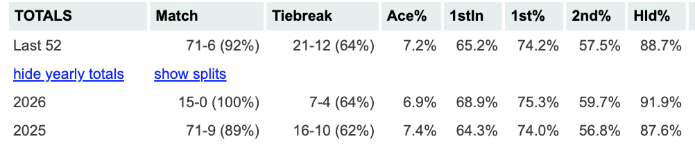 Alcarazin syöttöstatsit tälle kaudelle suorastaan hirvittävällä tasolla vastustajien näkökulmasta. Syöttöä on joulutauolla remontoitu ja syöttöliikettä uusittu, ei tässä kaverissa ole enää yhtään heikkoa kohtaa. Pysyykö Sinner enää kelkassa mukana, se nähdään tulevan kevät- ja kesäsesongin myötä.