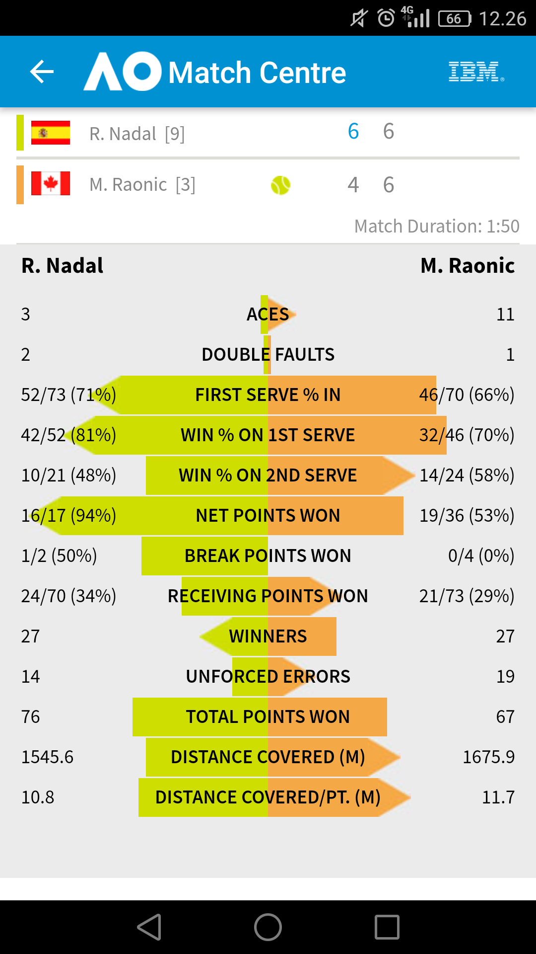 Nadal on yllättänyt minut kyllä totaalisesti. Mistä voi löytyä taas tuollainen fokus? Rystylyönnit noususta on aivan liekeissä ja syöttö aiheuttaa jatkuvasti vastustajille ongelmia. Kuten Muratouglu analysoi, niin Nadal on vaihtanut syötön paikkaa ja syöttää enemmän kohti sekä oikeakätisen vastustajan kämmenelle. Se on hankala syöttö ajoittaa lyöntiä, varsinkin jos fiilis ja ajoitus ei ole kohdallaan. Veikkaan että taas oli jotain ongelmaa Raonicin jaloissa tai alavartalossa. Raonicilta aivan d-luokan suorituksia kyllä noihin lyhyisiin paikallaan pompanneisiin korkeisiin palloihin rystylle. Herra jumala, ei varmaan kertaakaan verkon yli koko matsin aikana! Tai no, alussa hän laittoi yhden slaissatun version takarajasta yli. Lopulta Milos veti matsin lopussa kahdenkäden rystyn niin kovaa kuin ranteista lähti, tällä kertaa puoleen väliin verkkoa. Ei voi olla totta! Tällä tasolla! Ei tuo varmaankaan Milosin leipälyönti ole, mutta eihän nyt voi olla noin huono lyönti ellei ole joku henkinen vamma tai sitten fyysinen.