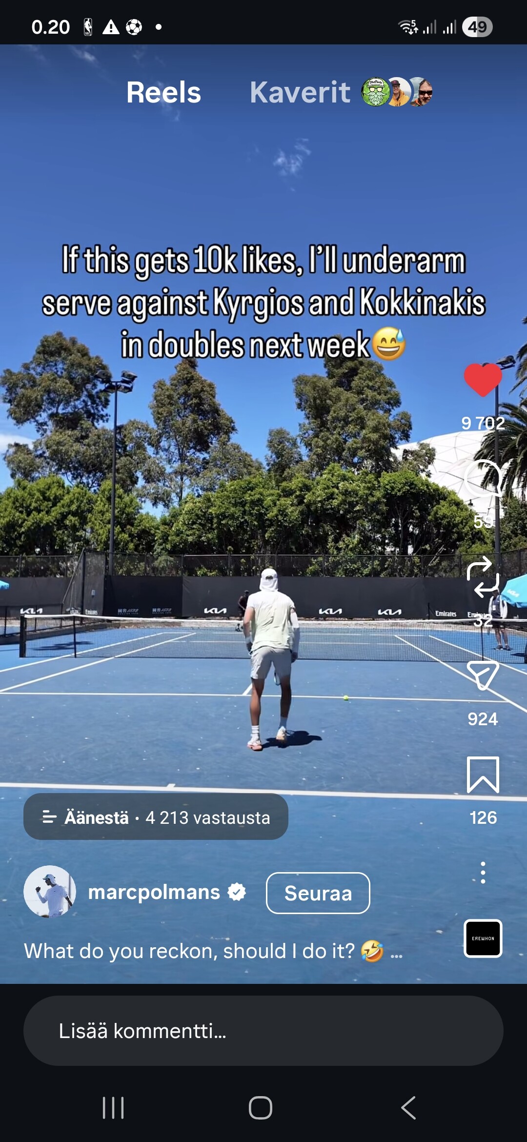 Tämä. Ja jännät matsit näytettiin loppuun asti mielenkiintoisista asetelmista, vaikka pääkentälle olisi ollut astelemassa joku top5 pelaaja.