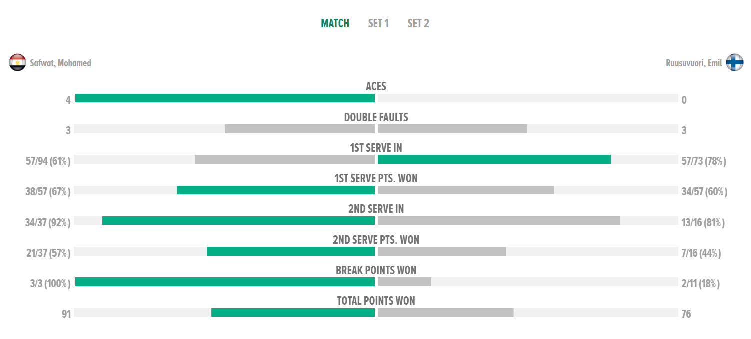Varmaakin varmempi 6-3 6-4 voitto. Egyptiläisillä ottelussa vain yksi breikkipallo, jota eivät saaneet otettua.