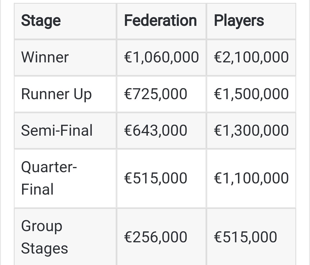 Eikös sentään tuo 1,1 miljoonaa ole se, joka jaetaan liiton ja pelaajien kesken. Ja rahat saa vasta kun homma on ohi. Välieristä 200k lisää, finaalista toinen 200k. Voittaja saa sitten 2,1 miljoonaa.