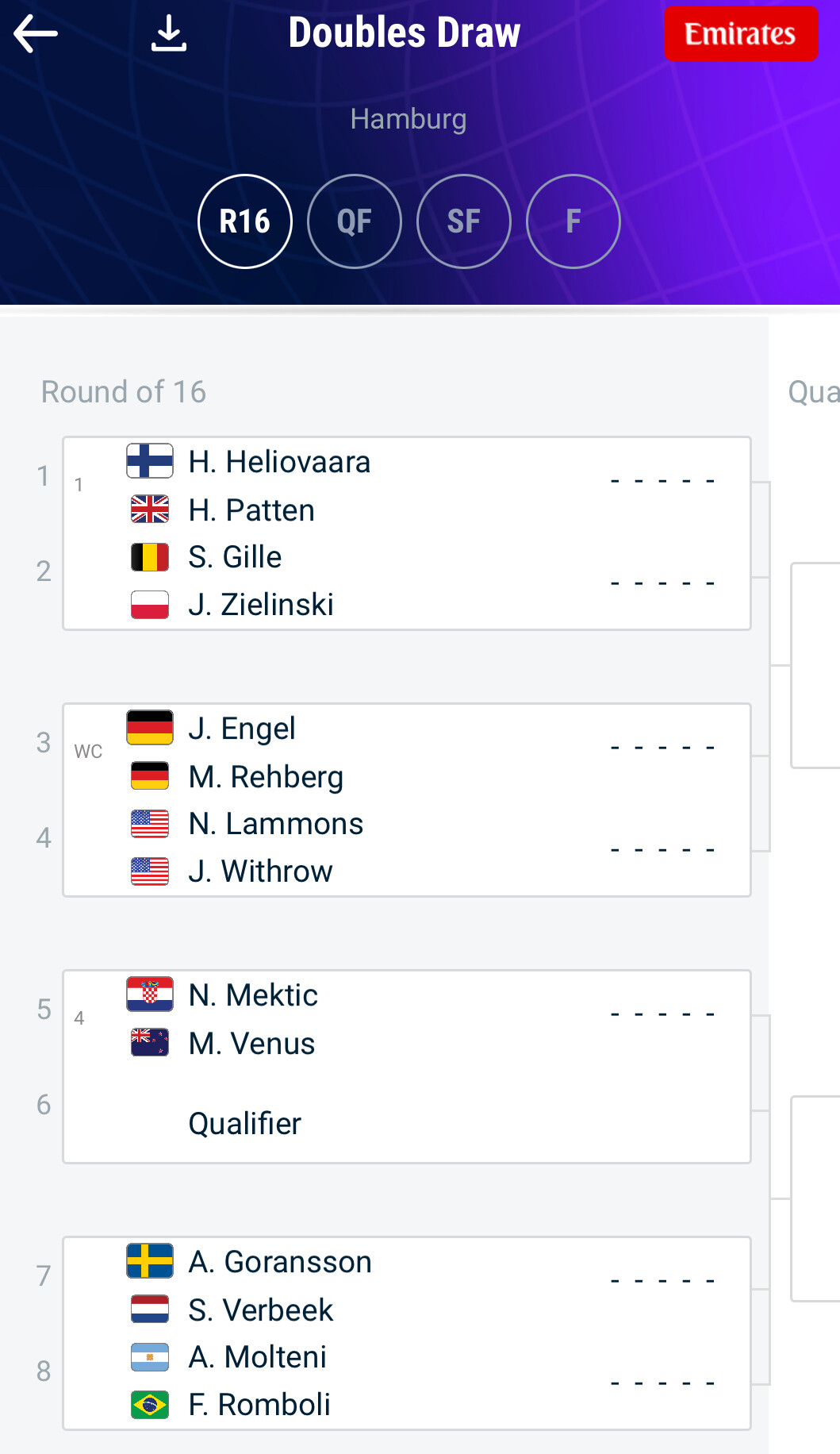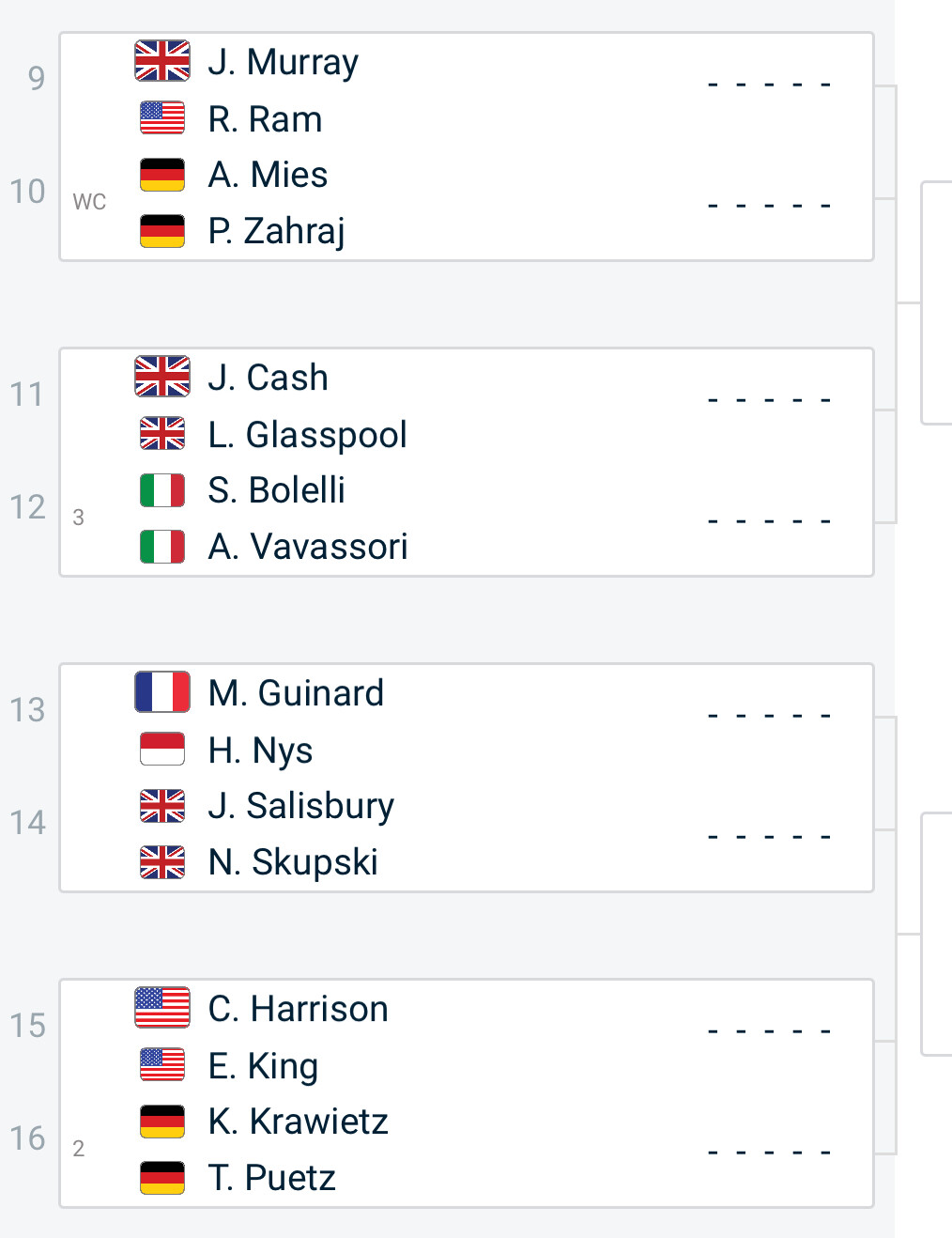 Vähän helpotti kaavio ainakin paperilla kvartsin osalta. Vastaan saksalaiset villikorttilaiset Engel/Rehnber, jotka peittosivat jenkit MTB:ssä. Myös [4] Mektic/Venus lauluun H/H:n kaavion puolikkaasta
