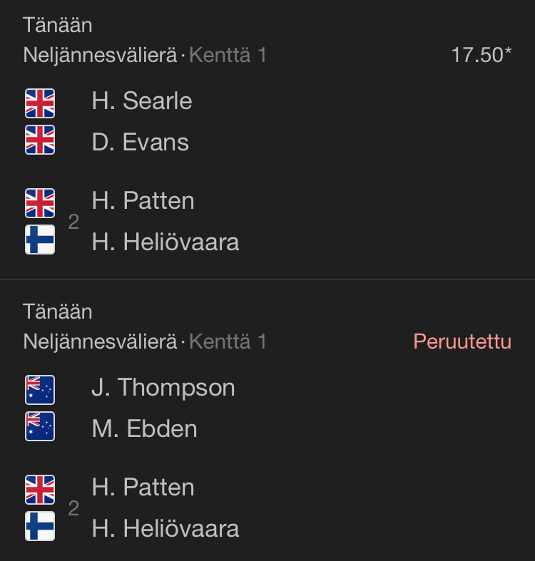 Näköjään myös karsintojen avauskierroksella hävinnyt Galloway / Bhambri noussut kaavioon Popyrin / de Minaurin tilalle. Bhambri varsinkin ollut Harrille ja Pattenille hankala vastus, joten toivottavasti kävi tuuri ja Evans / Searle paria vastaan peli rullaa. Ei siinä, Evans myös ihan pelimies nelurin puolella.