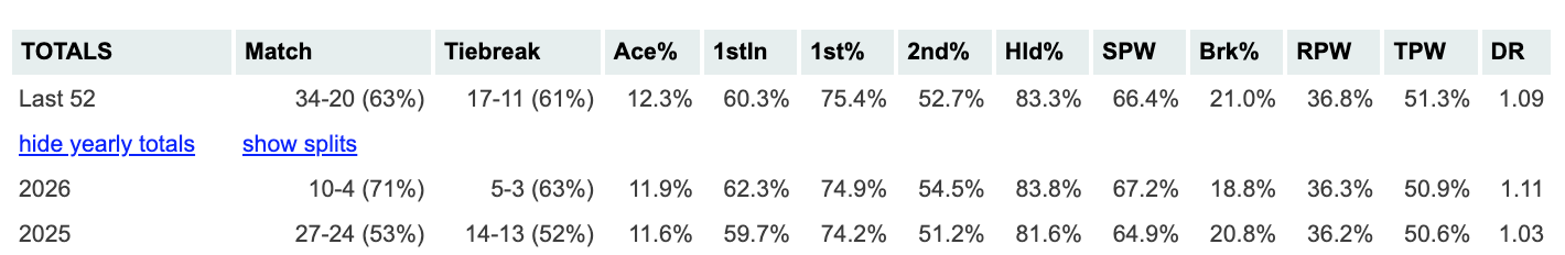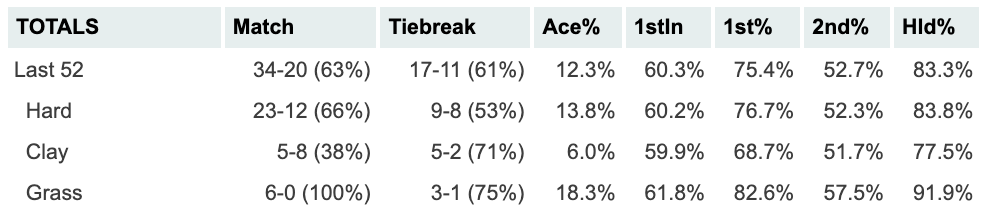 Ruohokausi tuonee jälleen plussaa kokonaistilastoon, näin se pitääkin Oton kohdalla olla et kasilla alkaa ykkösen voittokeskari ja tuollahan näkyy vallan mallikas yli 90 syötönpitoprosentti, suoranaista Sinner-laatua. Viime kauden ruohot oli yksi hyvä Challenger ja yksi ATP-matsi, se on vähän et mitä enemmän matseja sitä luotettavampaa dataa saadaan pidemmän ajan keskiarvoista. Mut ruohokauden ongelma joka kerta et matsimäärät jää aika pieneksi per kausi, aika paljon kesän vireestä kiinni et miten kauniit tilastot saa taottua. Ei siellä ole montaa ohikisaa varaa vetää ja ollaan tilastojen näkökulmasta aika ruman puolela.