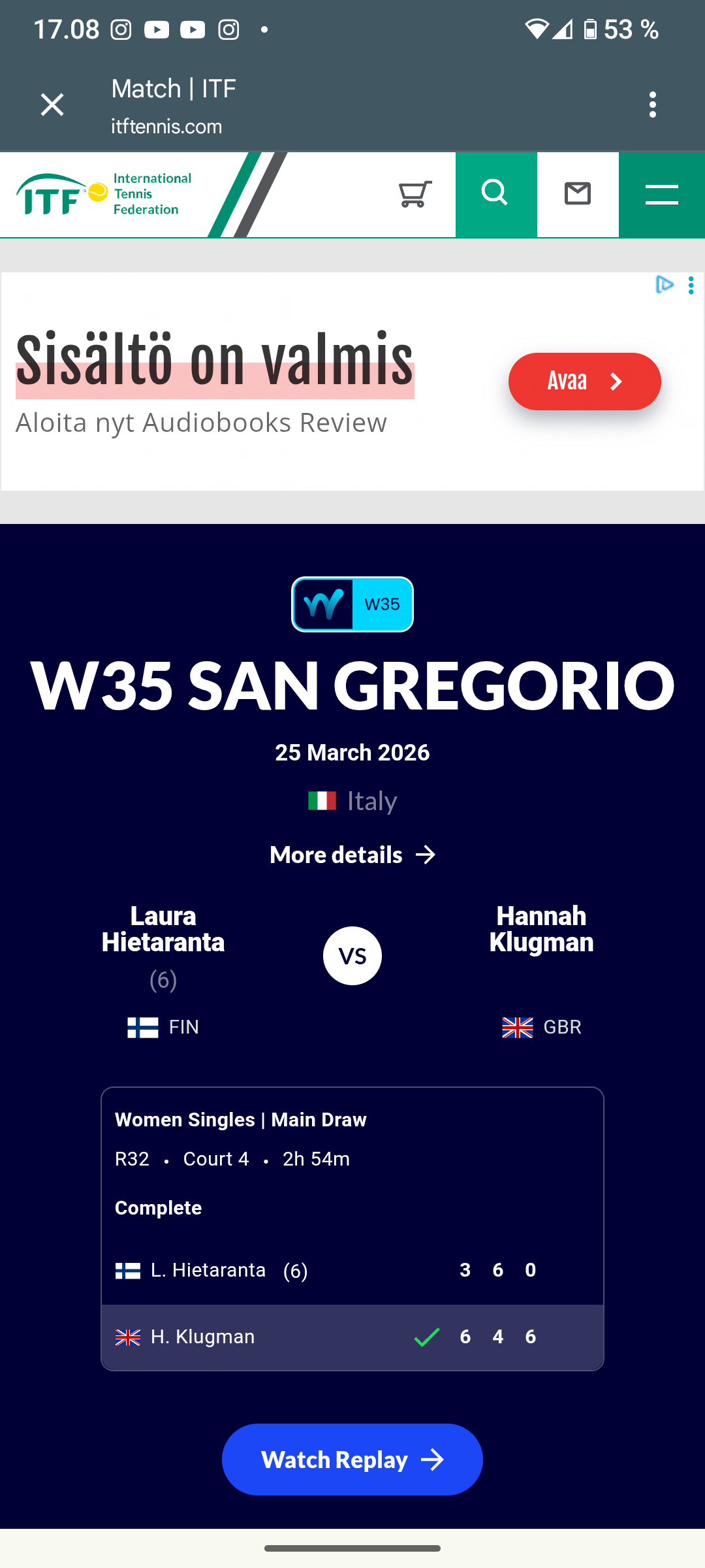 Ella Haavisto meni Italiassa W35:ssa nelurissa eilen puolivälieriin. Tänään Laura on aloittanut oman turnauksensa. Tilanne L. Hietaranta - H. Klugman GBR 3-6, 6-4, 0"-1…