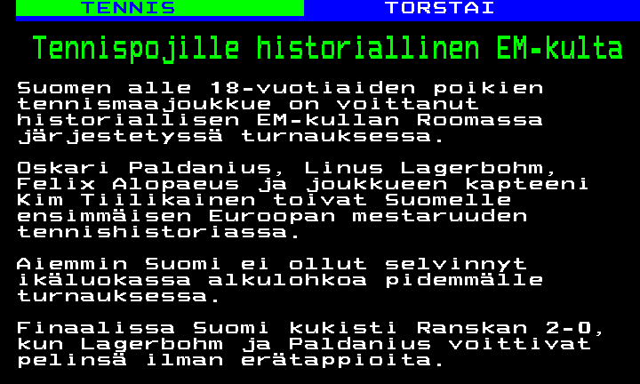 16-vuotiaiden SM-kisojen tuloksista iloisimpana pomppaa esiin Kaius Ketolan paluu entiselle tasolleen. On toki kesällä jo hieman pelaillut ilmeisen pitkien vaivojen jälkeen, mutta viikonloppuna selvitti tiensä välieriin, jossa vuotta vanhempien ikäluokan ykkösemme Verneri Riikonen oli lopulta liikaa. Kaius kaatoi myös ITF-kisoja kolunneen ikätoverinsa Aatu Niemelän eli alkaa mukana entisessä kovassa kolmikossa, joka teki ihmeitä Euroopassakin 13-14 -vuotiaina. Sen kolmikon viime aikojen ykkösnimi Alex Tuomolin kruisaili finaaliin näytöstyyliin ja haastaa sitten Riikosen tänään.