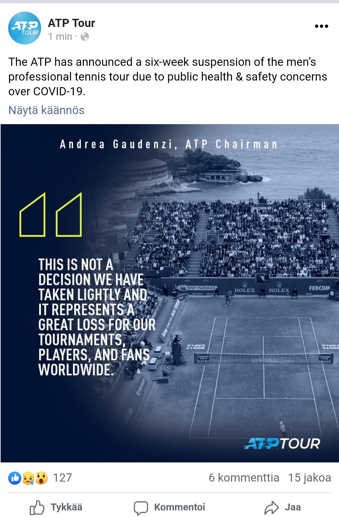 Myös kansallinen tennis peruttu huhtikuun alkuun asti.