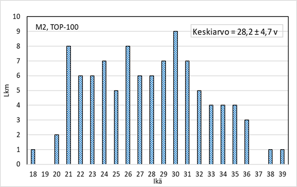 Katselin vähän tämän päivän ikäjakautumia miehissä ja naisissa 2-ja nelinpelissä TOP-100:n osalta. Naiset ovat kaksinpelissä keskimäärin 1,5 vuotta miehiä nuorempia, nelinpelissä ikäeroa on n. 4 vuotta.