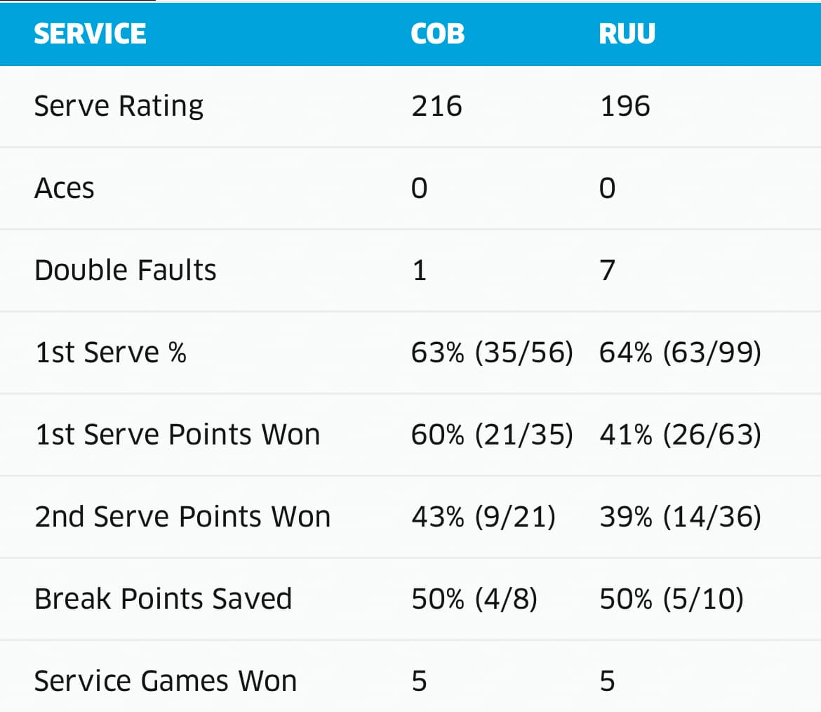 Yhteensä 180 ykkössyöttöä ja 60 ässää. Eli joka kolmas syöttö ässä. Ei ihme, ettei ottelussa ollut yhtään murtopalloa, mutta sentään yksi (1) deuce-tilanne.