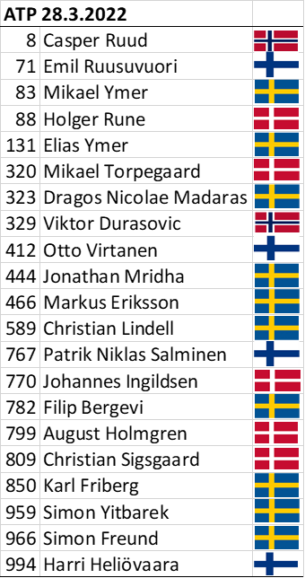 Tutkailin tämän päivän ATP-rankinglistaa maittain. Pohjoismaiden osuus TOP1000 -pelaajan listalla tosi pieni, yhteensä 21 kpl. Ranskalla ja USAlla on eniten palaajia, yli 90. Asukaslukuun suhteutettuna parhaat maat ovat Monaco, Slovenia ja Kroatia (joilla vähintään 3 pelaajaa tuhannen joukossa). Alla myös lista pohjoismaisista pelaajista TOP1000:ssa.
