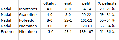 Jarkko on pärjännyt vähän paremmin Nadalia vastaan, voittanut jopa yhden erän, niinkuin Federeriltäkin. Robredolla lähes samat statsit kuin Niemisellä Nadalia vastaan. Alla ankeaa tilastoa taulukkona: